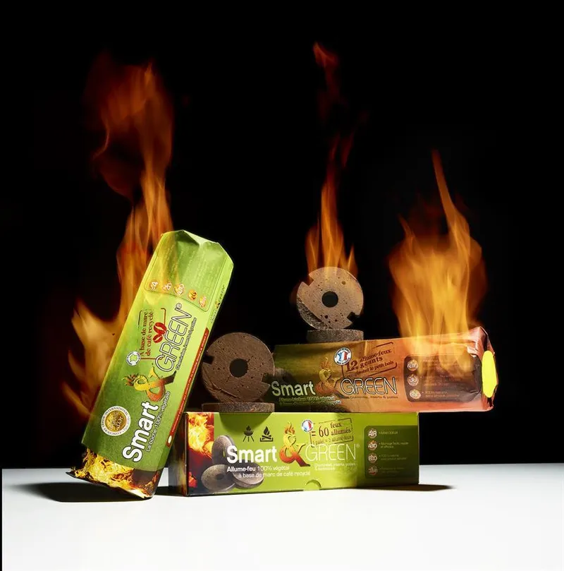 Smart & Green is a company which transforms used coffee grounds into eco-friendly firelighters, such as logs and firelighters. Taking advantage of coffee's high lipid content (around 6%), which gives it a high calorific value—67% higher than firewood—they developed their own industrial process to compress this waste into a clean, efficient, and practical fuel.